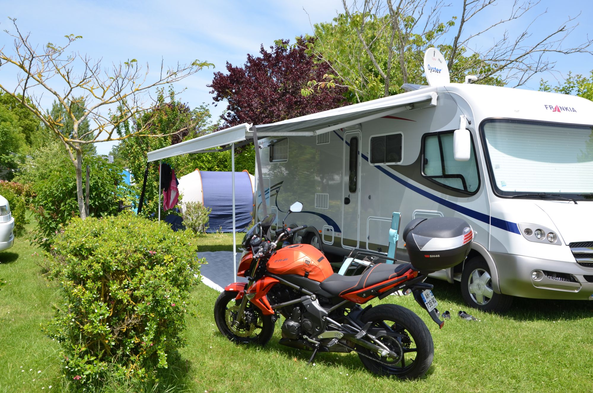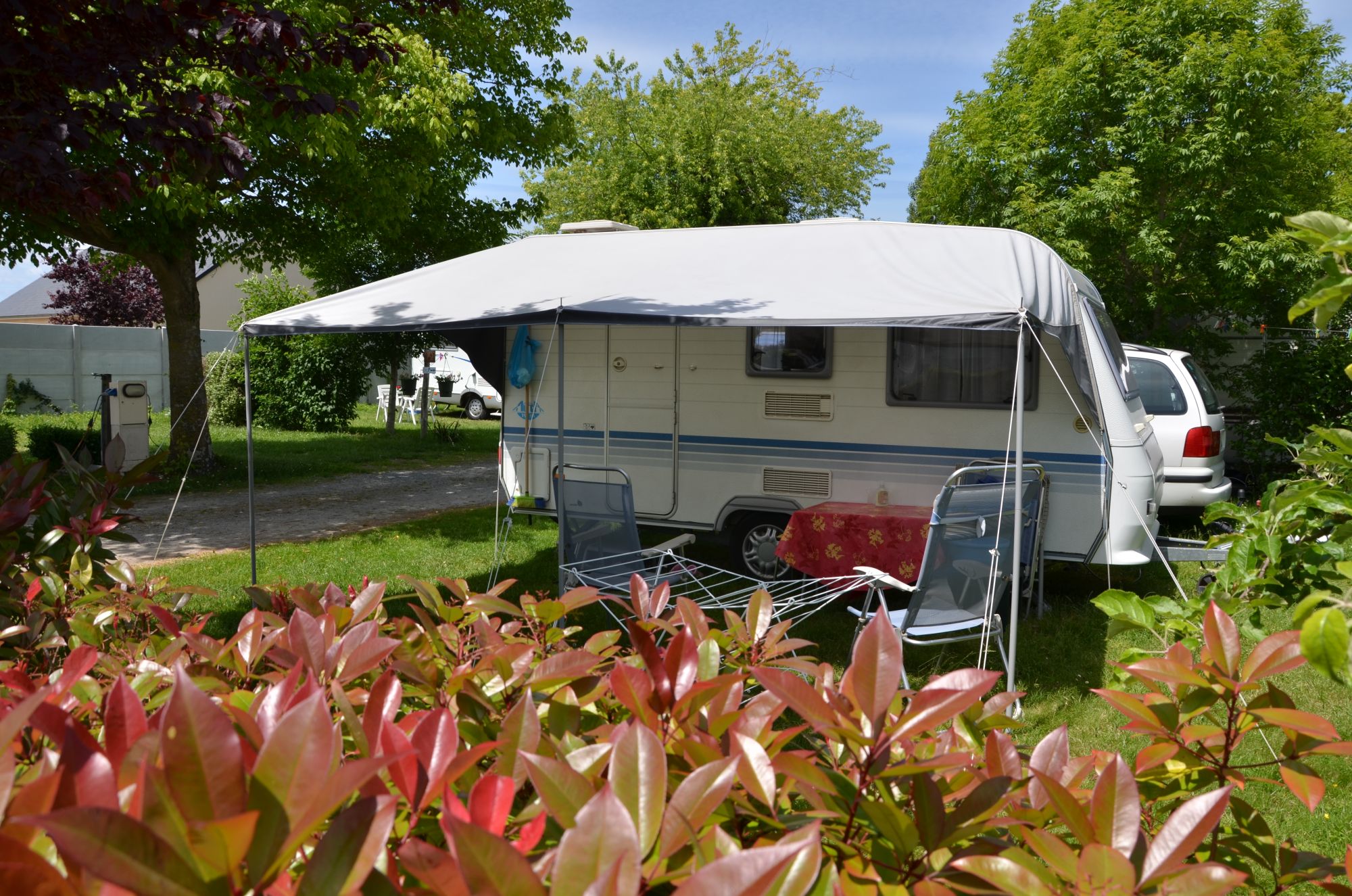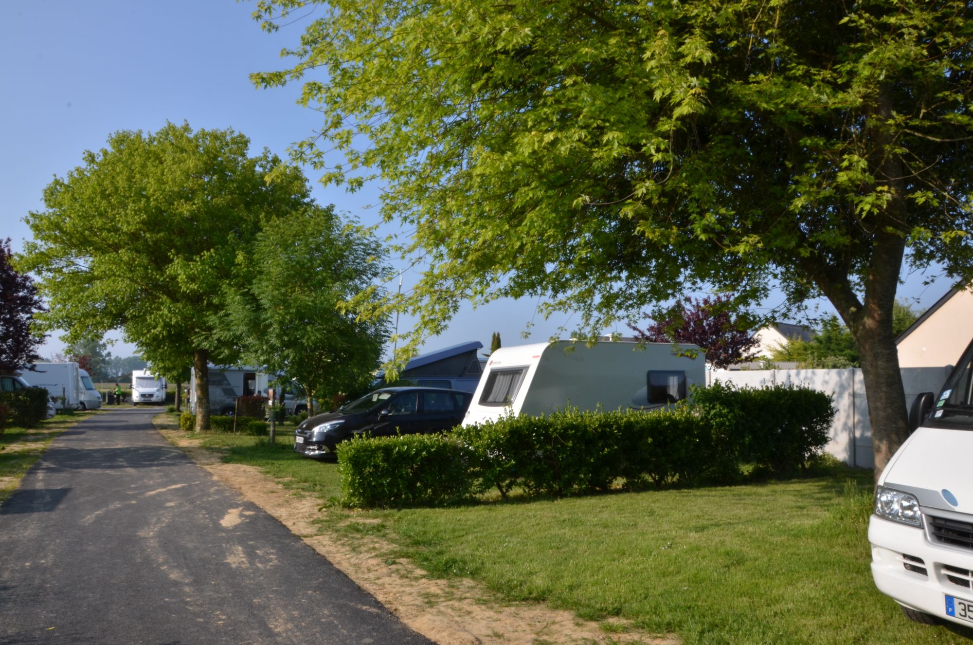 17 Emplacements de camping en pelouse délimités de haies pour accueillir votre caravane, camping-car ou toile de tente.